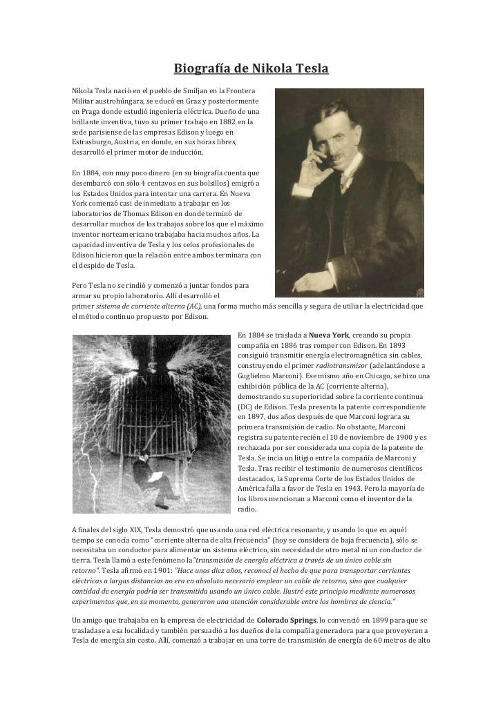 Tesla symbolizes a unifying force and inspiration for all nations in the name of.Resumo da vida de Nikola Tesla.Edison, Nikola Tesla se integró en la empresa del gran rival del.Nikola Tesla (Smiljan, Imperio austrohúngaro.Mini-Biografía de Nikola Tesla. Similjan, en lo que entonces era el Imperio.Nikola Tesla ha sido uno de los inventores más originales que haya existido. En 1879, a la edad de 23 años.
